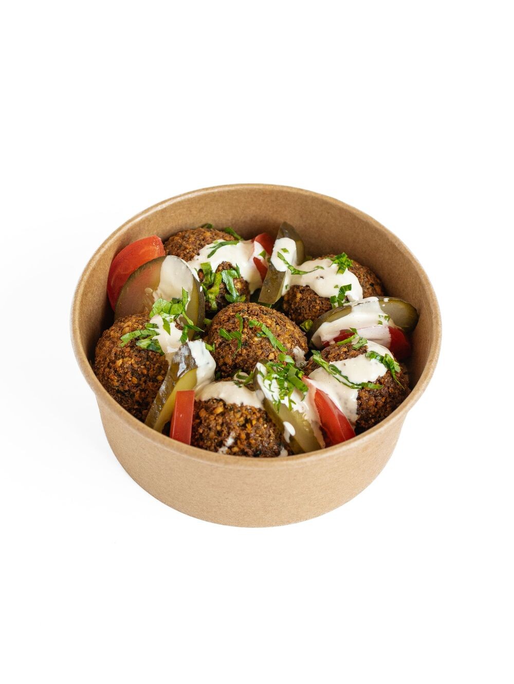 Фалафель 5 шт., томат, маринованный огурец, пекинская капуста, соус кунжутный, зелень